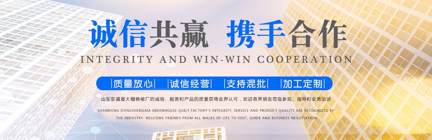 山東東盛夏大棚棉被廠是專門從事大棚棉被,大棚保溫棉被,蔬菜大棚棉被,溫室大棚棉被,防水大棚棉被,大棚棉被廠家等產品生產的企業(yè)。公司擁有專業(yè)的設計、生產和銷售團隊,并運用先進的科學技術和現(xiàn)代化管理手段為廣大客戶提供優(yōu)質的產品和服務?! 」局铝τ谔岣邷厥耶a品質量和農業(yè)保溫材料裝備水平,努力推進溫室產品技術進步和實現(xiàn)現(xiàn)代高效農業(yè)?! 」窘哒\為廣大用戶提供優(yōu)質的產品和貼心的服務,您的需求就是我們的目標?! ×⒆悻F(xiàn)在、展望未來在當今全球經濟一體化進程中充滿了機遇和挑戰(zhàn)。公司將不斷開拓、創(chuàng)新、完善自己。 “誠信、求實、開拓、創(chuàng)新”是我公司的企業(yè)精神。 為了能通過科技的力量為客戶生產一個品質靠得住的大棚保溫被,我們以“聆聽客戶心聲、追求卓越品質”作為我們企業(yè)的質量方針;以“每天前進一步,真誠服務”作為我們企業(yè)的服務宗旨;以“打造優(yōu)秀團隊,鑄就一流品質”作為我們企業(yè)的經營理念。我們通過堅守質量、服務與理念,成就讓視界更精彩的事業(yè)。 在前沿目標上,我們堅持做到目光長遠、思想創(chuàng)新、行動堅定,建立企業(yè)精神文化,讓全體員工擁有共同的信仰和目標,并且為之奮斗拼搏。同時,我們內心坦誠,言出必行,信守承諾,因為誠信是我們最重要的無形資產。...
